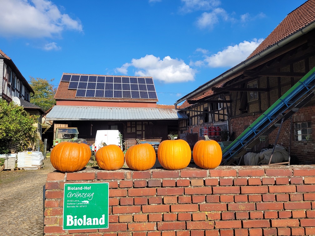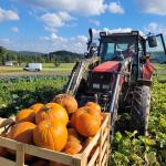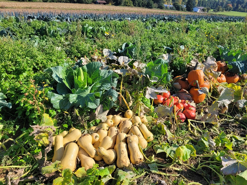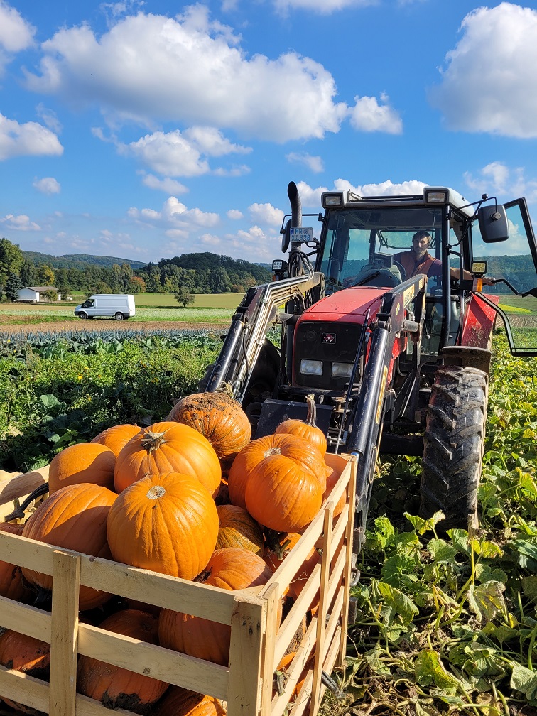 Am 1.10. hieß es morgens, wir brauchen 2 oder 3 Kisten für die Kürbisse. Oder nein, doch besser 4. Am Ende wurden es 12 Kisten, so gut war die Ernte! Hokkaido, Butternut und große Halloween-Kürbisse haben die Mitarbeiter*innen des Hofs sowie 2 Mitglieder zunächst gesucht, dann von den Ranken abgeschnitten, begutachtet und, wenn keine großen Verletzungen oder Schimmel dran waren, auf mehrere Haufen gelegt. Dort konnten wir sie später in große Holzkisten verladen, die mit dem Trecker über das Feld gefahren wurden. Das Suchen war übrigens ein bisschen wie an Ostern, bloß mit viel größeren Eiern - und mit schnellerem Erfolg! Hier ein paar Eindrücke von der anstrengenden, aber schönen Aktion bei strahlendem Sonnenschein findet ihr unten in der Gallerie.