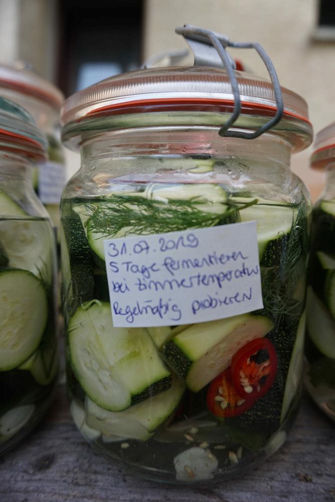 - 5 Tage bei Zimmertemperatur fermentieren lassen. Dabei täglich kurz öffnen, um Gase entweichen zu lassen. Die Zucchini und Blätter müssen unter Wasser bleiben, damit sich kein Schimmel bildet. Gegebenenfalls das Gemüse mit einem sauberen Stein beschweren. (Falls sich etwas Schimmel bildet, entferne die betroffenen Stücke und stelle das Glas in den Kühlschrank, um dort den Fermentierprozess zu beenden. Zucchini bei starker Verschimmelung oder krassem ekelGeruch wegschmeißen!) Nach 1 bis 2 Tagen wird das Wasser trüb und die Zucchini verändern ihre Farbe.