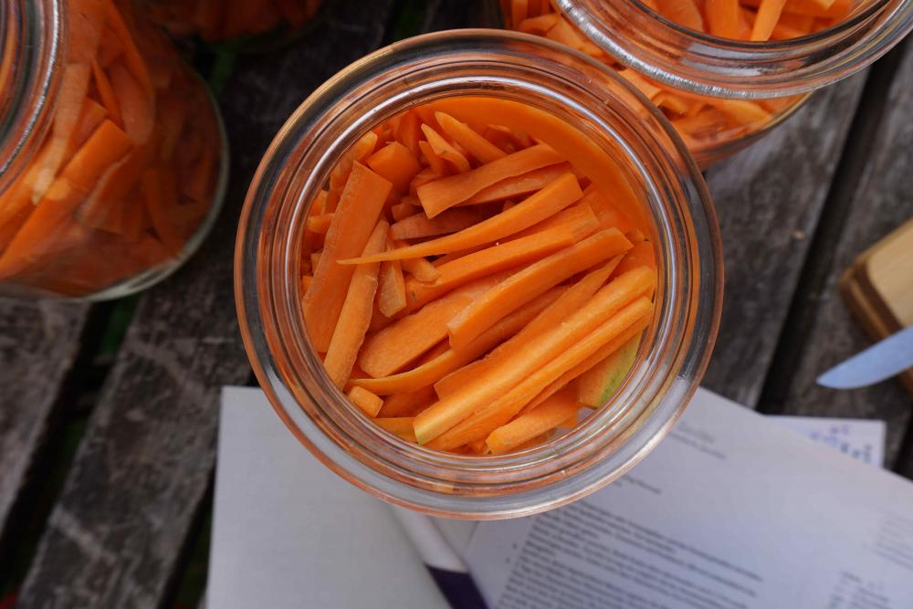 - Karotten in das Gärgefäß geben. Im Gärtopf oben ca. 10 cm Luft lassen. So viel Lake angießen, dass alles bedeckt ist. Übrige Lake im Kühlschrank aufbewahren. Sie hält sich ungefähr eine Woche. Falls nötig danach neue Lake ansetzen.