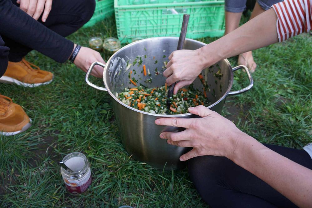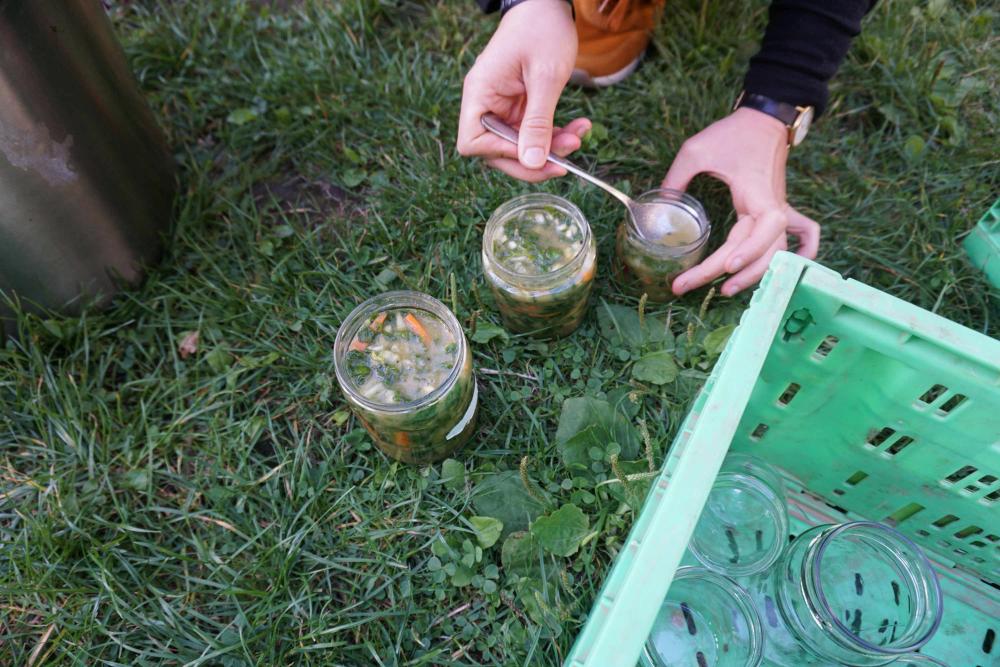 - Das Kimchi in Gläser füllen, darauf achten, dass keine Luft eingeschlossen wird, also fest nach unten drücken. Mindestens 1 cm Rand zum Deckel lassen. Den Glasrand säubern, Deckel drauf, nicht fest zu schließen, sondern eine viertel Drehung öffnen, damit entstehende Luft entweichen kann