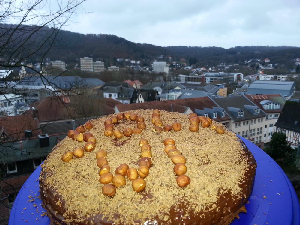 Den gut abgekühlten Kuchen mit einem großen Messer in zwei Teile schneiden. Oberteil abnehmen, Unterteil mit Schokocreme bestreichen. Oberteil wieder aufsetzen und mit geschmolzener Kuvertüre, wer mag auch mit geriebener Kuvertüre und ganzen Haselnüssen verzieren.