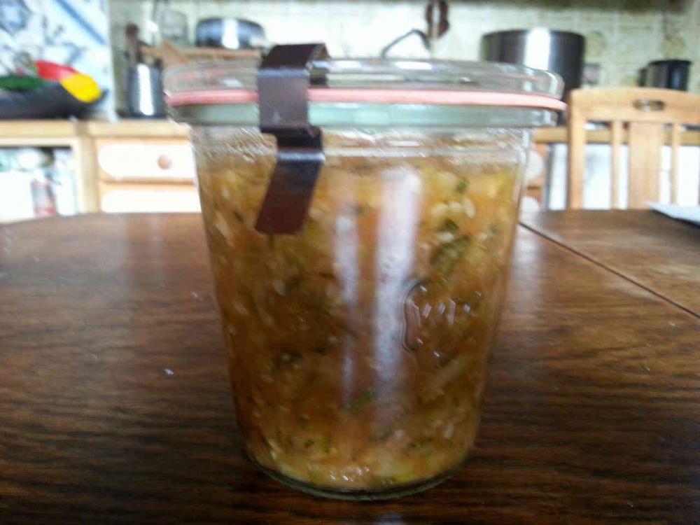 1. Die Zucchini und Zwiebeln schälen und durch den Fleischwolf drehen. Beides in einem großen Topf aufkochen, die Hitze reduzieren und ca. 1 Stunde köcheln lassen.